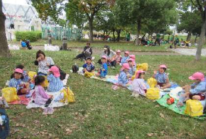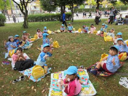 楽しみその2のおにぎりタイムです。保護者のみなさま、おいしいおにぎりをありがとうございました。おにぎりで、パワーをチャージして、広場で遊びました。虫取りをしたり、散策をしたり、