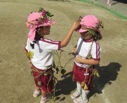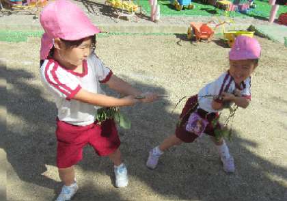 ツルで綱引きをしたり、体や頭に巻いてみたり、グルグルまわしたりして、いろいろな遊び方を考えていました。