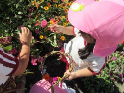 頭に飾った冠に、園庭に咲いている花を飾ったら、あら、ステキ!お姫様になったり、ファッションショーが始まったり… ワクワクしてきました。