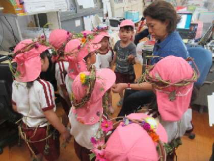いろいろな飾りが出来上がると、みんなに見てもらいたくて、幼稚園中を回りました。年長さんに見せて、給食調理員さんに見せて、園長先生に見せて、大満足!