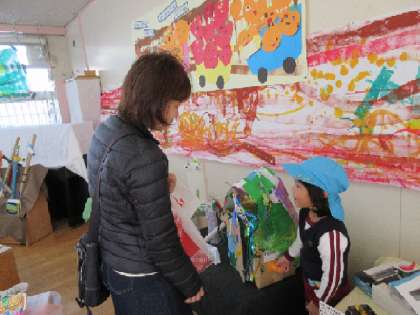 友達の作品についても、とてもよく知っていて、お家の人に「解説」していました。一緒につくったりかいたりすることを重ねる中で、友達の様子にも関心をもち、手伝ったりり、認め合ったりしてきたからですね。