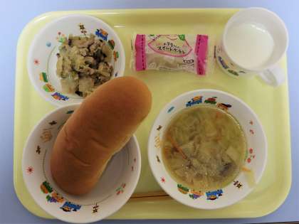 写真上 2日は、ぶたにくとやさいのソテー、スープ、スイートポテト、パン、ぎゅうにゅう