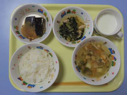 写真下 3日は、さばのおろしじょうゆかけ、ごもくじる、こまつなのにびだし、ごはん、ぎゅうにゅう