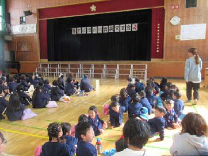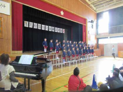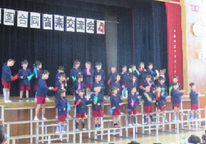 最初のプログラムの小学生の素敵な歌声を、真剣な表情で聞き入っていました。次はいよいよ九条幼稚園の出番。1曲目は『てびょうしおんがくかい』で、いろいろなリズムの手拍子を披露しました。2曲目は『どんぐりきのこおいも』です。小学生のお兄さん・お姉さんも一緒に、歌って遊んでくれて、盛り上がりました。3曲目は『みんな色のせかい』です。そら組が歌うのを何回も聞いていて、はな組も覚えて歌えるようになりました。たくさんの拍手をもらい、大満足でした。小・中学生の歌や合奏、吹奏楽を聞いて、刺激をいっぱいもらって帰りました。