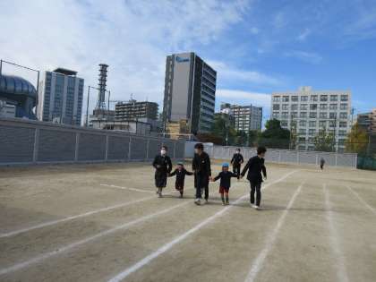 最後には、広い校庭を中学生と手をつないで走りました。「めっちゃ広いな〜!」「お兄ちゃん、こっちこっち!」「走るん、めっちゃ早いねんで!」と言いながら、一緒に楽しい時間を過ごしました。
