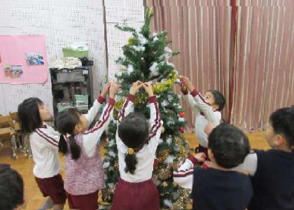 「わぁ!どれにしようかな」とオーナメントを選んで飾ったり、モールをぐるぐると巻き付けたりしました。「雪が降ってきたー!」とみんなで雪を投げて降らせたり、「白いおひげのおじいさん〜♪」と歌いながら、サンタさんになったりして、楽しんでいました。「サンタさん、来てくれるかな〜」と期待もふくらんでいます。