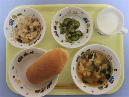 9日:ちゅうかおこわ たまごスープ きゅうりのあえもの パン ぎゅうにゅう