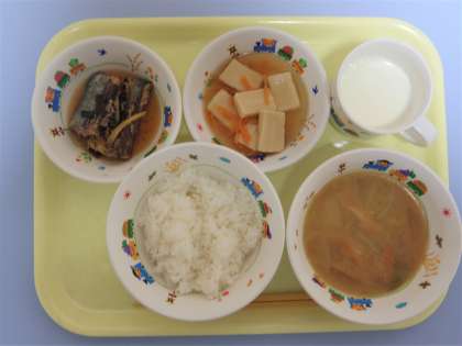 10日:さばのしょうがに みそしる こうやどうふのにもの ごはん ぎゅうにゅう