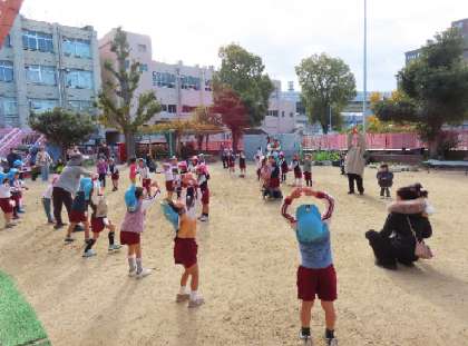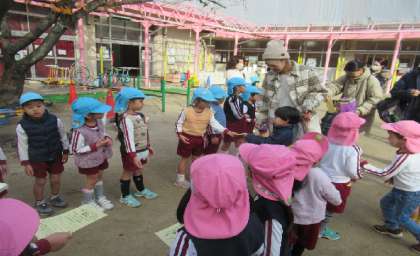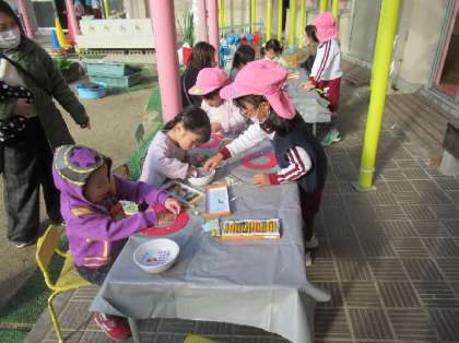 今日は「ひよこ」のお友達が来てくれました。5歳児そら組が用意したフープや三角コーンのコースや三輪車、砂遊びなど、寒さに負けず楽しく遊んでいました。パスやシールを使って、リースもつくりました。最後はみんなで『秘伝 ラーメン体操』!!