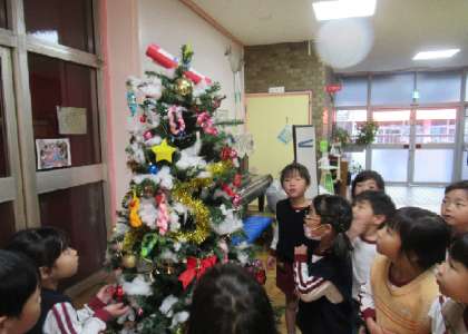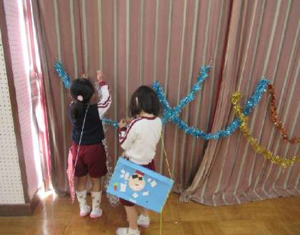 5歳児そら組が、遊戯室中をキラキラモールで飾り付けてくれて、お楽しみ会の用意ができました!サンタさんに来てくれるかな?