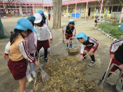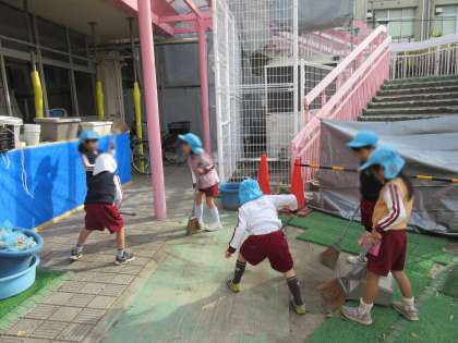 ほうきを使ってテラスの掃除をしたり、ドッチボールやリレーで使っていた白線を消したりして、園庭もとてもきれいになりました。