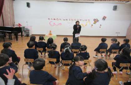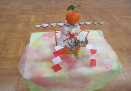 壁面には、4歳児はな組のつくったかわいいヘビがいます。今年の干支は巳(み ヘビ)ですね。巳年の意味や、飾ってある鏡餅の由来や飾ってあるものの意味も園長先生に教えてもらいました。「ダイダイ」や「串柿」「昆布」「ウラジロ」を近くで見たり、匂いを嗅いだりもしました。最後に、壁面にある絵凧や字凧を見ながら、みんなで「たこの歌」を歌いました。