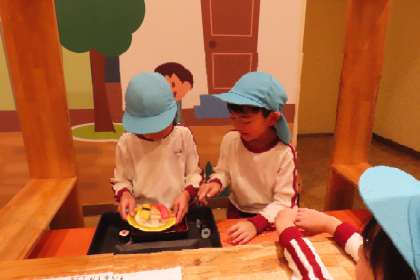 館内では、お店屋さんやスーパーマーケットでの買い物など楽しんだり、階段やはしごを上り、高い橋をドキドキしながら渡るなど、自分のしたい遊びを次々見つけて楽しんでいました。たくさん体を動かしたので、おなかがペコペコでご飯の時間に!