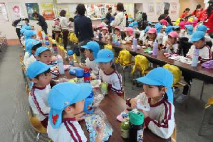 「3つ持ってきたよ」「こんぶとわかめのおにぎり」と言って見せ合ったり、「スーパーで100円のを3つ買ってん」「私も〇〇ちゃんも780円やった」「滑り台面白かったね」などと、午前中の楽しかったことを話したりしながら、おにぎりをみんなで一緒に美味しくいただきました。