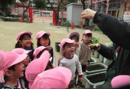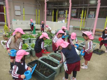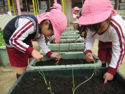 「それなあに?」「わかった!ダイコン!」「ちがうよ、ダイコンはあれだよ」「ほんまや。あ、ネギ!」と、苗を見てあれこれ考えました。タマネギの苗だとわかったら、今度は、どの部分にタマネギができるのか、想像して、「てっぺん!」「まんなかのとこ」・・・さて、どこにできるでしょうね。お楽しみ!