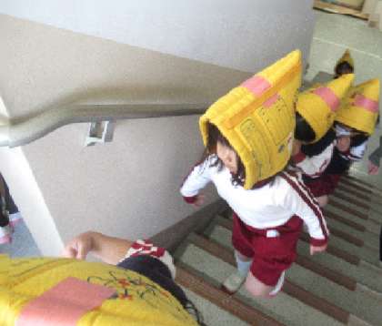 地震発生の放送を聞いて、まずは椅子や机の下に隠れてから、園庭に一次避難。津波が来ることを想定して、隣接する九条東小学校の4階に二次避難します。二次避難の訓練は2回目なので、4階までの階段も、しっかりとした足取りであがりました。