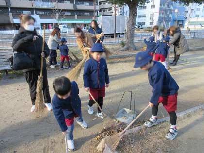 登園後、幼稚園前の公園を保護者の方と一緒に掃除しました。