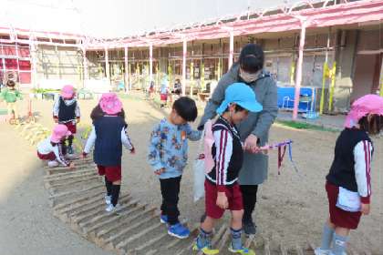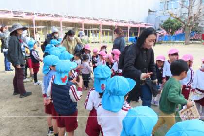幼稚園の子どもたちは、小さい友達とどんなもので遊びたいか考えて準備したり、受付で「おはよう、名札どうぞ」と迎えたりしていました。