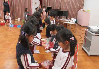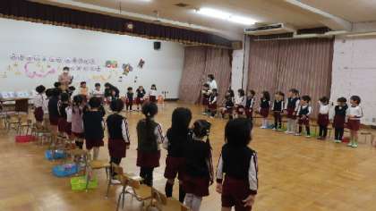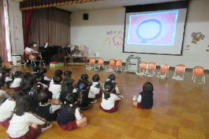 続いて園長先生に、「あなたがうまれたひ」というお話をスクリーンで見せてもらいました。見えないほど小さかったみんなが、おなかの中でだんだん大きくなって、生まれてきてくれた日、お家の人はとっても嬉しかった。その日のことは忘れないよ…というお話でした。子どもたちは真剣な目でスクリーンを見つめていました。