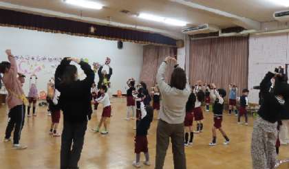 最後はみんなで『秘伝 ラーメン体操!』どんぶりストレッチもきまって誕生会終了です。