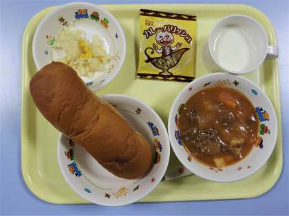 23日……(写真上)ビーフシチュー カリフラワーとコーンのサラダ カレーフィッシュ パン ぎゅうにゅう