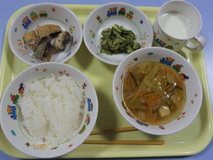 24日……(写真下)さばのカレーたつたあげ ごもくじる きゅうりのあまずあえ ごはん ぎゅうにゅう
