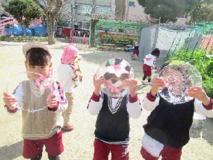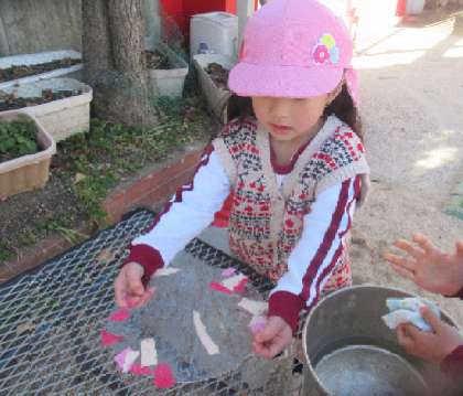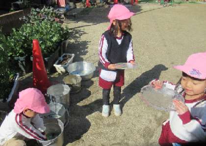 1月の寒い日に、イチョウの葉っぱを入れたバケツに氷が張り、大喜びだった4歳児はな組。「今度はお花の氷をつくりたい」と素敵なアイデアが出ました。残念ながら、花があまり咲いていないので、代わりに画用紙をちぎって花びらにして水に浮かべていました。毎朝「凍ってるかな?」「ただの冷たい水やったわ」と登園時に確認していましたが、ついに今日、凍りました!念願のカラフル氷に大喜び!でも冷たい!『手のお風呂』用のバケツで、手を温めながら、氷の冷たさや硬さなどの感触を味わい、季節を感じて遊びました。