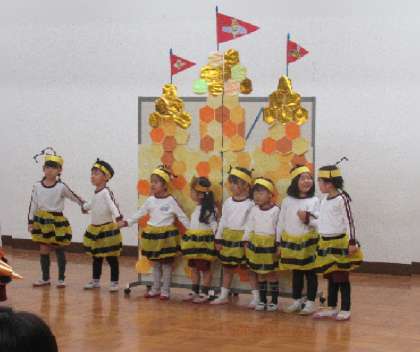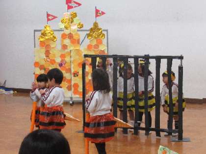 みんなで「力を合わせてお城を守る」ことも、どうやったら守れるか、スズメバチ役も交えて相談しました。いろいろ考え、意見を出し合ってきた劇遊び。