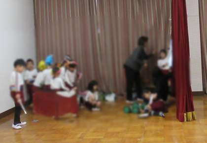 そら組は幕を開けたり閉じたり、舞台裏で移動したり、大道具を出したり、効果音を鳴らしたりと、見えない部分も自分たちでしています。友達の様子をよく見て、タイミングを見計らって、係の仕事もしていました。