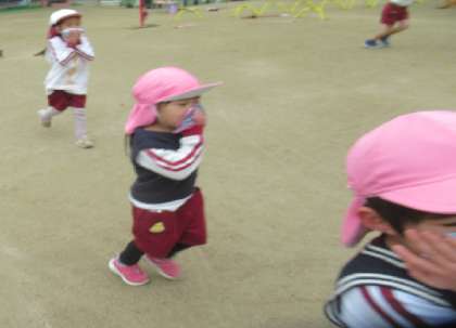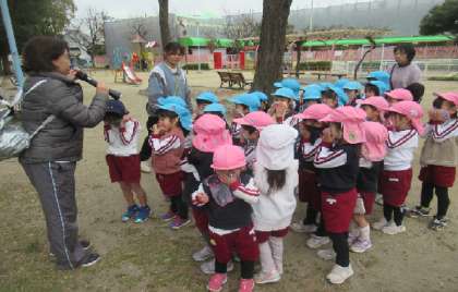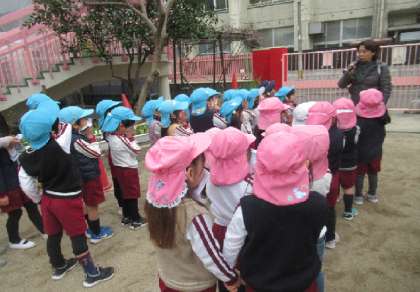 今日は園庭で遊んでいる時に、火災を知らせるベルが鳴りました。放送を聞き、遊んでいるものをさっとおいて、火事の煙を吸い込まないよう鼻と口をハンカチで押さえて、近くにいる先生のもとに集まります。玄関の方のお家が燃えているということなので、離れた東小学校側の門の方に移動し、その後東門を出て公園まで避難しました。みんな「おさない」「はしらない」「しゃべらない」「もどらない」の約束を守って避難できました。