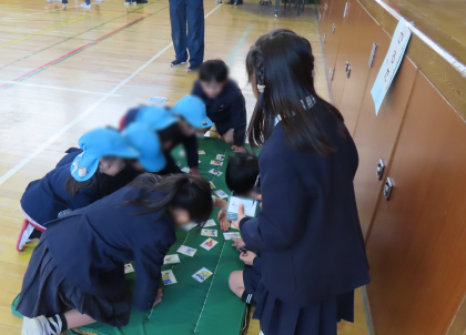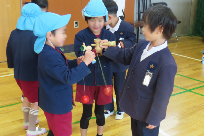 おはじき・ヨーヨー・こま・けんだま・かるた・あやとり・おてだまのコーナーがあり、遊び方を聞いてから一緒に遊びます。「どうやってやるの?」「やってみる!」「見て!出来たよ!」など、話をしながら1年生と一緒に遊ぶことを楽しんでいました。