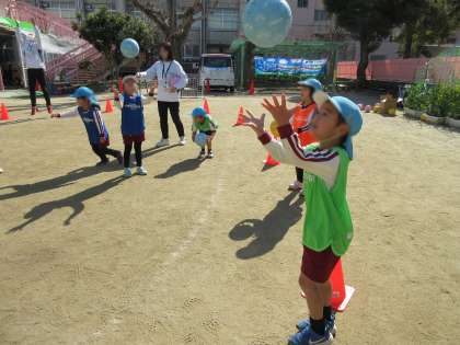 そして、サッカーボールを1人1つ使い、上に投げてキャッチ!自分で考えた高さのレベルをだんだん上げて、高く投げてキャッチしたり、投げたボールの下をくぐってキャッチしたり、2回くぐったりしてからキャッチするなどしてボールに慣れました。