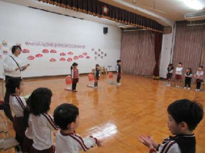 誕生児たちには、1年間、待ちに待った誕生会です。みんなで『拍手をプレゼント』の歌を歌って、お祝いです。ドキドキしたようですが、ハキハキとしっかりと自己紹介をして、大きな拍手をもらいました。お家の方からの一言もいただき、嬉しそうでした。4歳児はな組からは、手づくりのグローブとボールのプレゼントを渡しました。