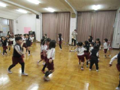 これで、みんな一つずつ大きくなったので、4月から順番に、「〇月に誰が誕生日か」を大きな画面で見て、振り返りました。その後、全員で『お誕生月なかま』をしました。自分の生まれ月になったら、みんなの前をスキップで回ります。お家の方にも参加してもらいました。