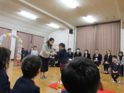 ひとりずつ園長先生から受け取り、「大きくなったら何になりたいか」「幼稚園で楽しかったこと」「小学校で頑張りたいこと」を、それぞれの言葉で発表しました。