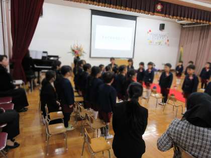 続いて、修了児が、思い出の写真で幼稚園生活を振り返りながら、お別れの言葉と歌で、思い出や感謝の気持ちを話しました。