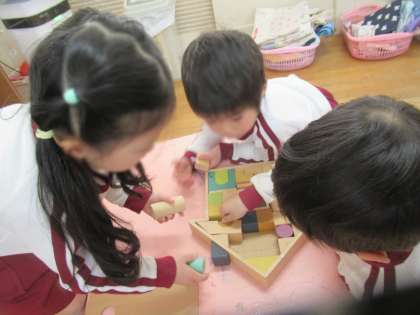 早速、積み木を積んでみたり、組み合わせてみたり、箱に戻してみたり・・・いろいろな遊び方をして楽しんでいました。