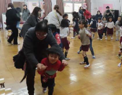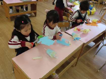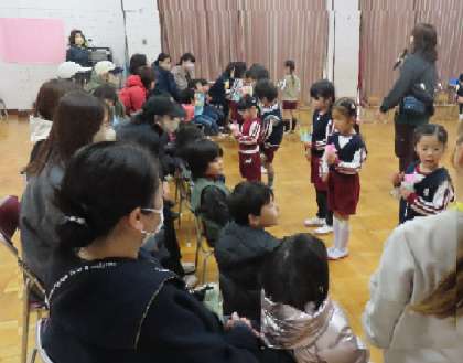 みんなで大型絵本をみたり、仲良し遊びや体操をしたり、はな組の子どもたちが考えたマジックショーもしたりと、盛りだくさん!最後はプレゼントを渡して、「入園式で待ってるよ」「一緒に遊ぼうね」と声をかけました。