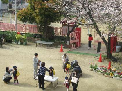 元気に「おはようございます!」と登園してきた子どもたちは、お家の人にピカピカの名札をつけてもらいました。サクラの花も、他の花もきれいに咲いて、子どもたちを待っていました。