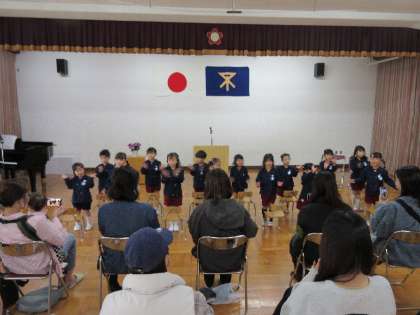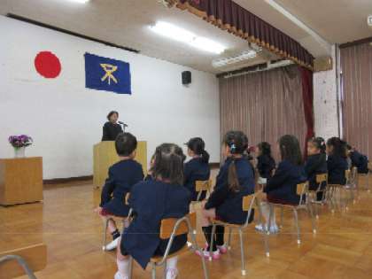 始業式では、園長先生から新しく九条幼稚園に来た教職員の紹介や担任発表を聞いて、それぞれお世話になる先生たちに「よろしくお願いします」と大きな声で言えましたね。最後に、お家の人に歌も聞いてもらいました。