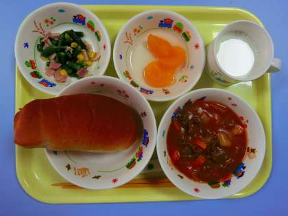 17日(木)… ビーフシチュー ベーコンとさんどまめのソテー みかんのかんづめ コッペパン ぎゅうにゅう