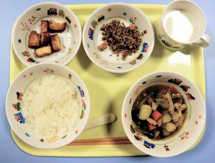 18日(金)… けいにくとじゃがいものにもの あつあげのしょうゆだれがけ べにさけそぼろ ごはん ぎゅうにゅう