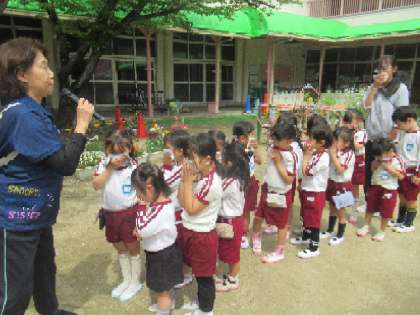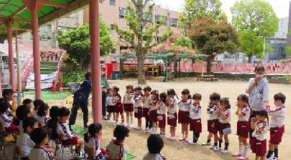 4歳児はな組は、テラスから5歳児そら組の様子を見学しました。園内での火災を想定した訓練で、非常ベルの音を初めて聞いて少し驚く様子もありましたが、落ち着いて静かに5歳児が避難するところを見ていました。