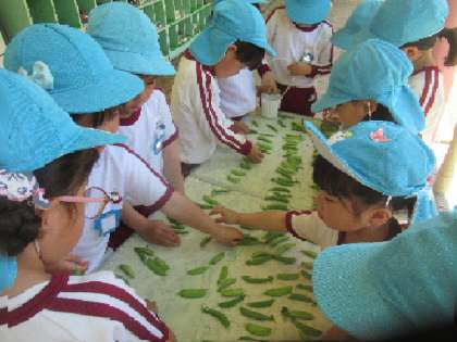 5歳児そら組が、去年植えたエンドウ豆の種。ぐんぐん大きくなって、たくさん実りました。収穫してお家で食べたら、お家の人の口には入らないくらい、子どもたちがパクパク食べるほどおいしかったので、地域の方にもおすそ分けです。