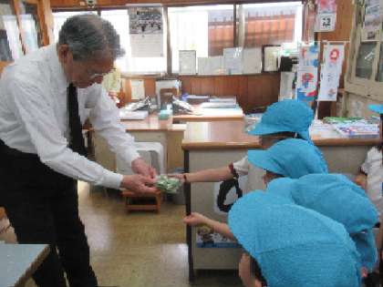 いろいろとお世話になっている地域の方に「自分たちで種から育てました」「192個あったよ」「豆ごはんにしたらおいしいよ」「おいしく食べてください」など、各々が考えて話をしながら渡しました。「豆、大好きです。ありがとう」などと言っていただき、こちらも嬉しくなりました。