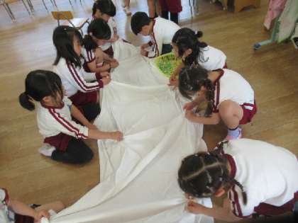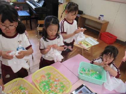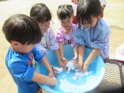 まずは、ビー玉を布にくるんで、輪ゴムでくくります。初めは難しかったけど、何回かしているうちに要領がわかってきて、次々たくさんしばりました。自分の布がいっぱいになったら、今度は大きな布に「真ん中が届かへん」「こうやったら届くよ」など言いながら、みんなでたくんさんのビー玉をくくりつけました。染める前の下準備で、水で洗います。暑い日なので、水が気持ちよかったですね。