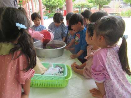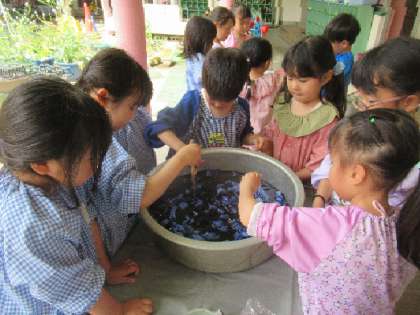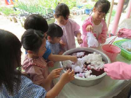 いよいよ染めます。染め液ができると「お〜〜っ!!」、漬けてみて「お〜〜っ!!」と歓声があがります。「青じゃなくて黒やん」「でもこの辺は紫に見えるよ」「こっちはきれいな赤やな」「青と赤でミャクミャクや!」と各々の感想が聞かれました。浸かるまで20分間、「洗濯機や」と、ずっと混ぜ混ぜしている子もいました。