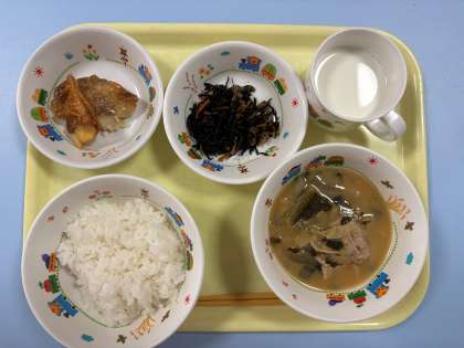 8日 … あかうおのしょうゆだれかけ みそしる ひじきのいために ごはん ぎゅうにゅう