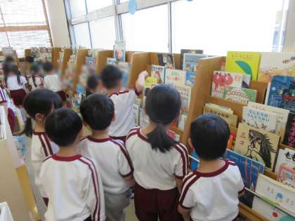 はな組の子どもたちも、お兄さん、お姉さんに優しくしてもらって、とても嬉しそうな表情で、絵本室で本を見る、借りることへの興味が高まったようでした。