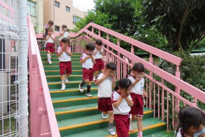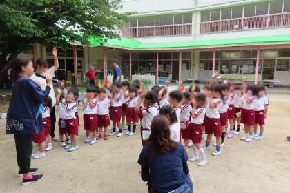 4歳児はな組は前回の避難訓練で、そら組のお兄さん・お姉さんがしている姿を見て、今回は初めて自分たちも避難しました。